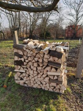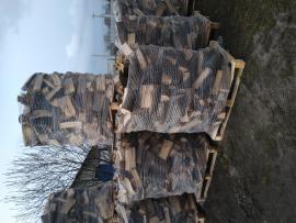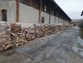 Prodám palivové dřevo- suchý dub,štípaný 33 cm,baleno v sítí na paletě á 1,6 prms.