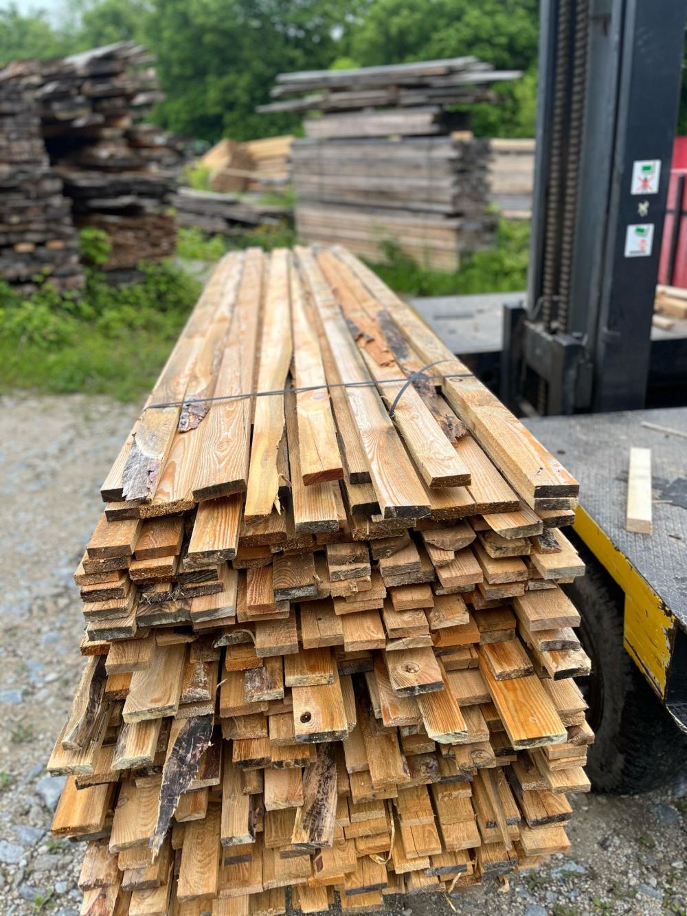 Prkna jsou naskládáná v balíku a mají různé délky. Proloženo po 5vrstvách .